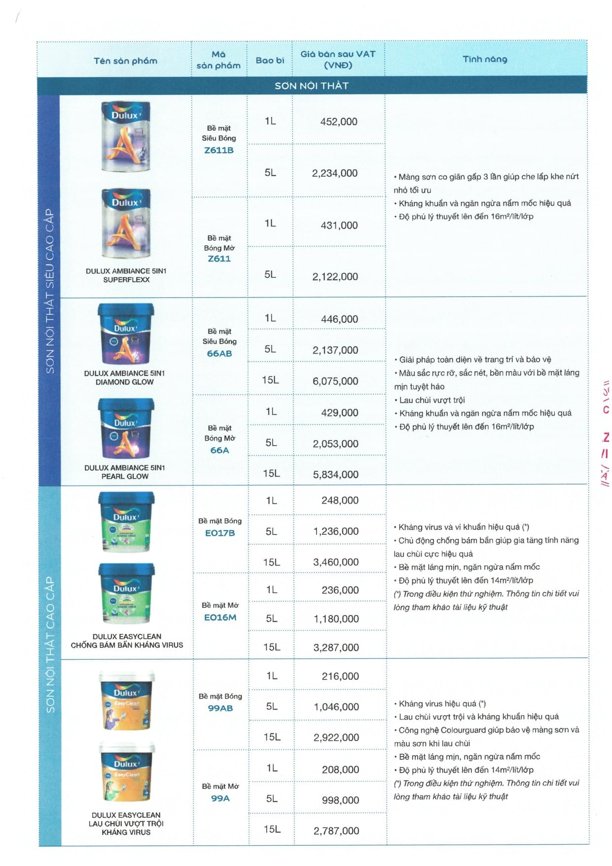 | Sơn trong nhà cao cấp Dulux Easy Clean chống bám bẩn, kháng Vius E017 5 lít giá: 15 lít giá: |