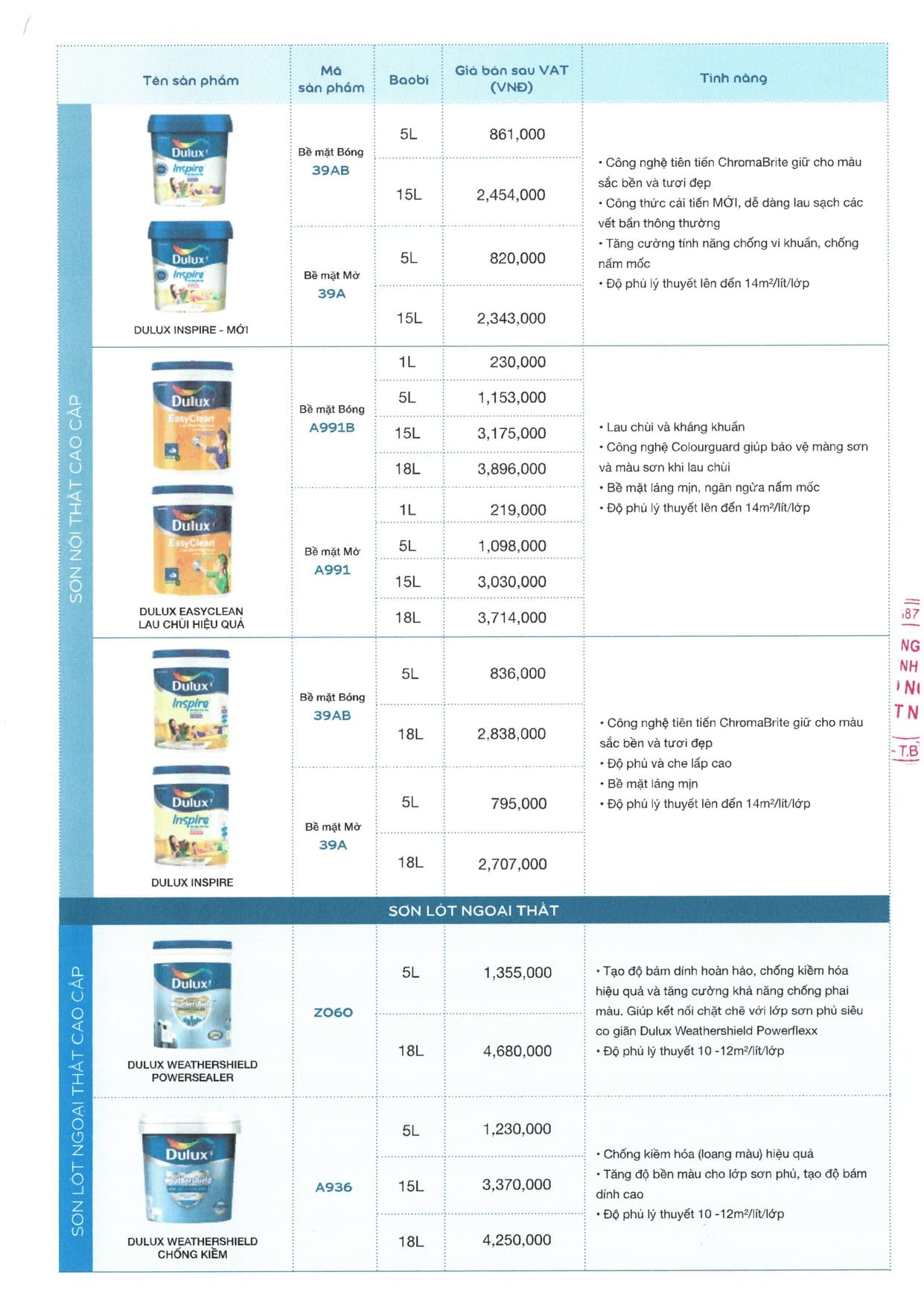 BẢNG GIÁ SƠN DULUX MỚI NHẤT 2025