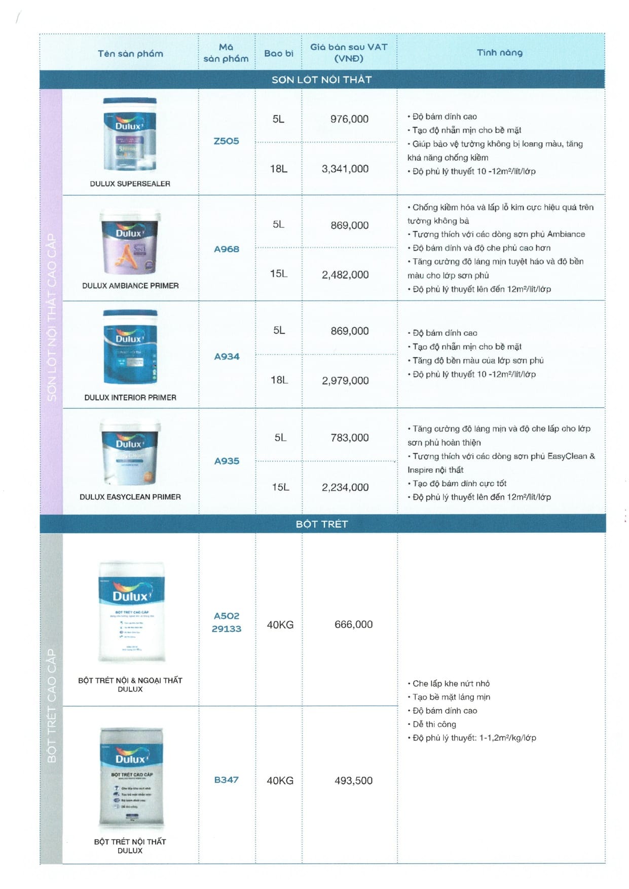 | Bột bả Dulux ngoài trời Cao cấp A502 Bao 40kg giá: Bột bả Dulux trong nhà cao cấp B347 Bao 40kg giá: |